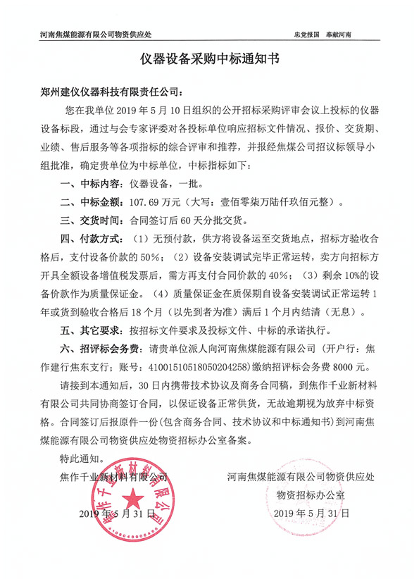 焦作千業(yè)新材料儀器設(shè)備中標(biāo)通知書